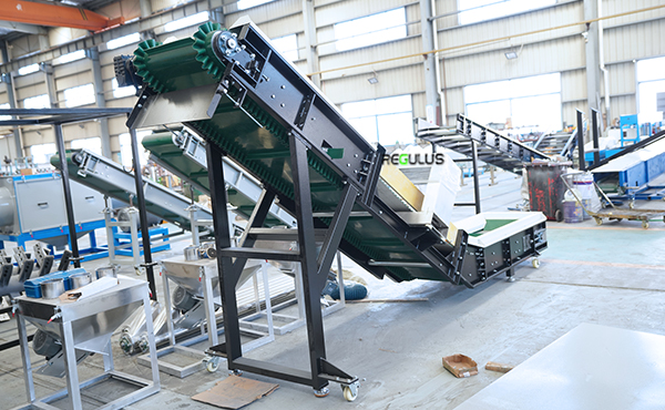 The plastic waste is conveyed into the crusher through the belt feeding device; The device adopts ABB/Schneider frequency converter for frequency control. The conveying speed of the belt feeding device is linked with the fullness of the crusher, and the speed of the conveyor belt is automatically adjusted according to the current of the crusher.